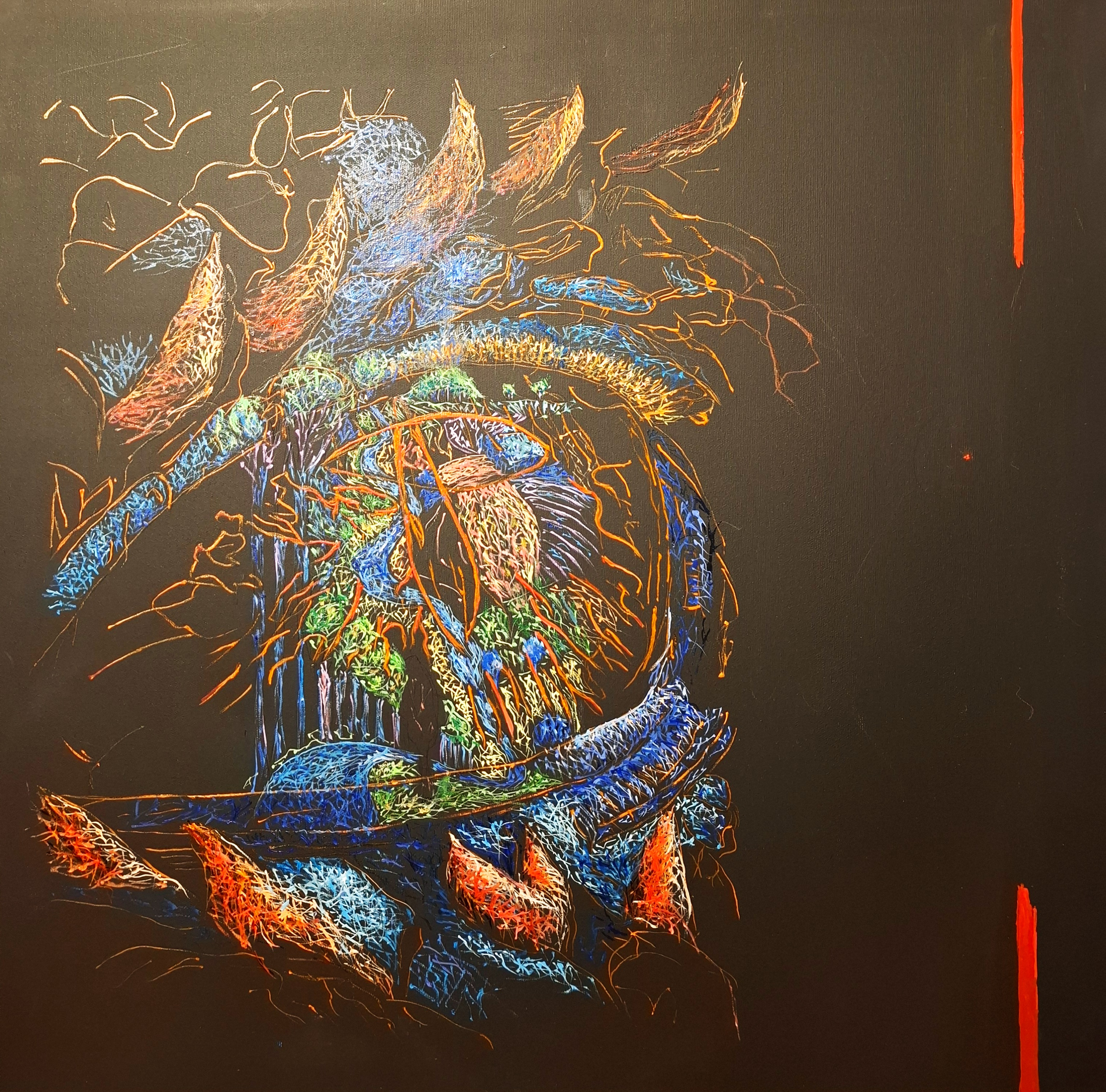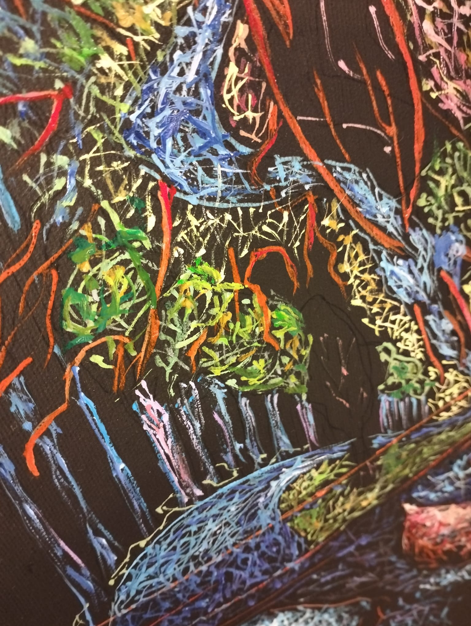Este un peisaj al paradoxului si al profunzimii, unde realitatea se impleteste cu visul. in centrul imaginii, un ochi imens se deschide ca o fereastra spre infinit. in loc de iris, adaposteste o padure adanca, un labirint de copaci tacuti isi inalta coroanele. Padurea din ochi respira, fosneste, traieste propriul timp, iar printre crengile sale se filtreaza doua fante subtiri de lumina – ca niste portaluri ce taie intunericul, cautand un adevar. Un punct singuratic pluteste in acest spatiu enigmatic, un fir de esenta pura, un atom al intelesului nedeslusit. intreaga scena pare prinsa intr-un subtil al existentei, unda - particula si o data impleteste destinul, o poveste despre dualitate perceptie si mister. Unda sau particula
